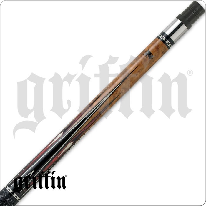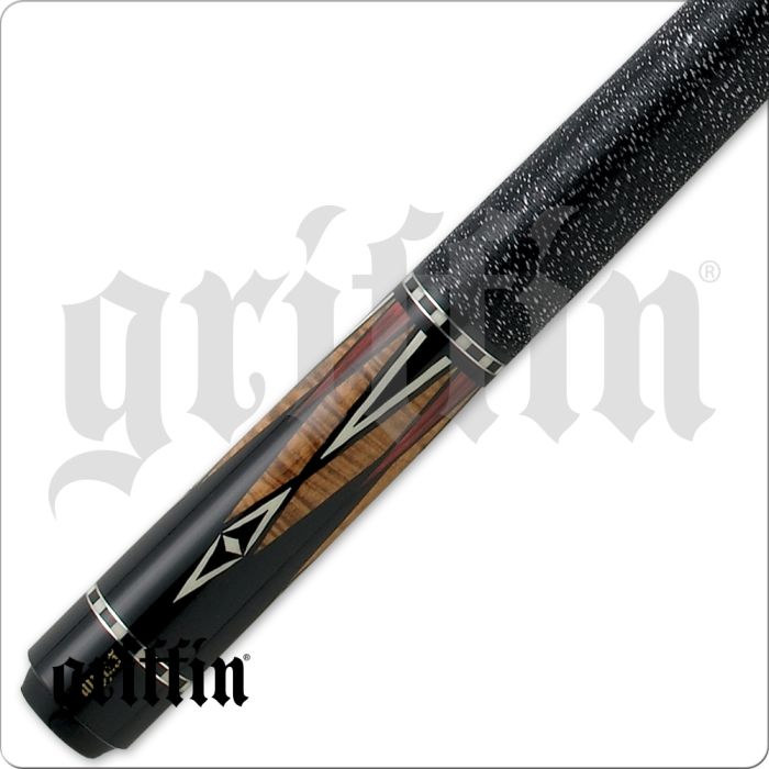If you're looking for a high performance cue without a high price tag, the handsome Griffin GR17 pool cue is an excellent choice. Geometric design overlays of ebony, red and white adorn the dark stained hardrock maple forearm and black stained hardrock maple sleeve, and black and white rings add the finishing touches to the design. A black Irish linen wrap with white specks allows you to maintain control of the cue's compact, solid hit, which is similar to a Joss or Schon cue.